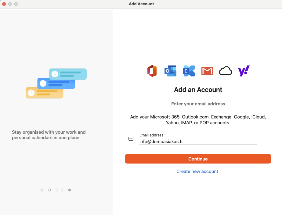 Paina Continue/Jatka ja tilin pitäisi nyt olla lisätty.