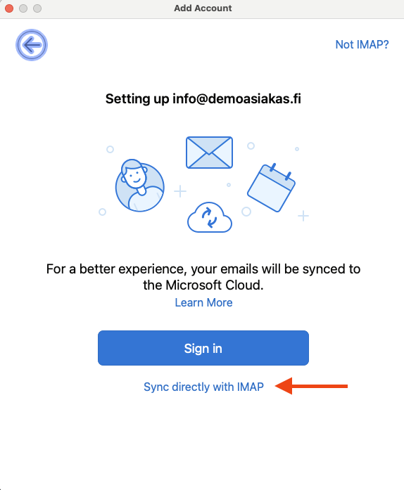Klikkaa ylemmässä kuvassa nuolella merkattua kohtaa Sync directly with IMAP.