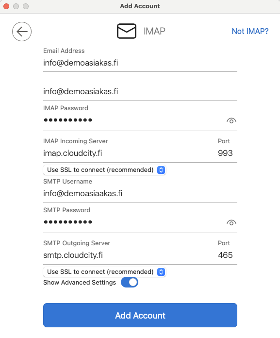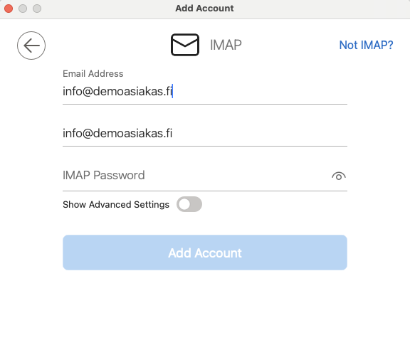 Tarkista, että tili lisätään IMAP -muodossa. Jos ylhäällä olevan kuvakkeen vieressä lukee POP -niin klikkaa oikeasta yläkulmasta Not POP? -painiketta ja valitse listasta IMAP.